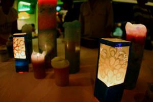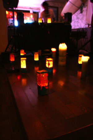 ミシェールアロマの時間と共に香りが変わる暖かい色使いのキャンドルとデコレーションをてがけてくれたフラワーシャワーの春菊の廃油キャンドルがすばらしい空間を演出!